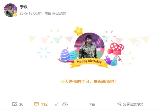 05月18日讯 今天是前国足主帅李铁的48岁生日,他的微博自动给他过了生日。