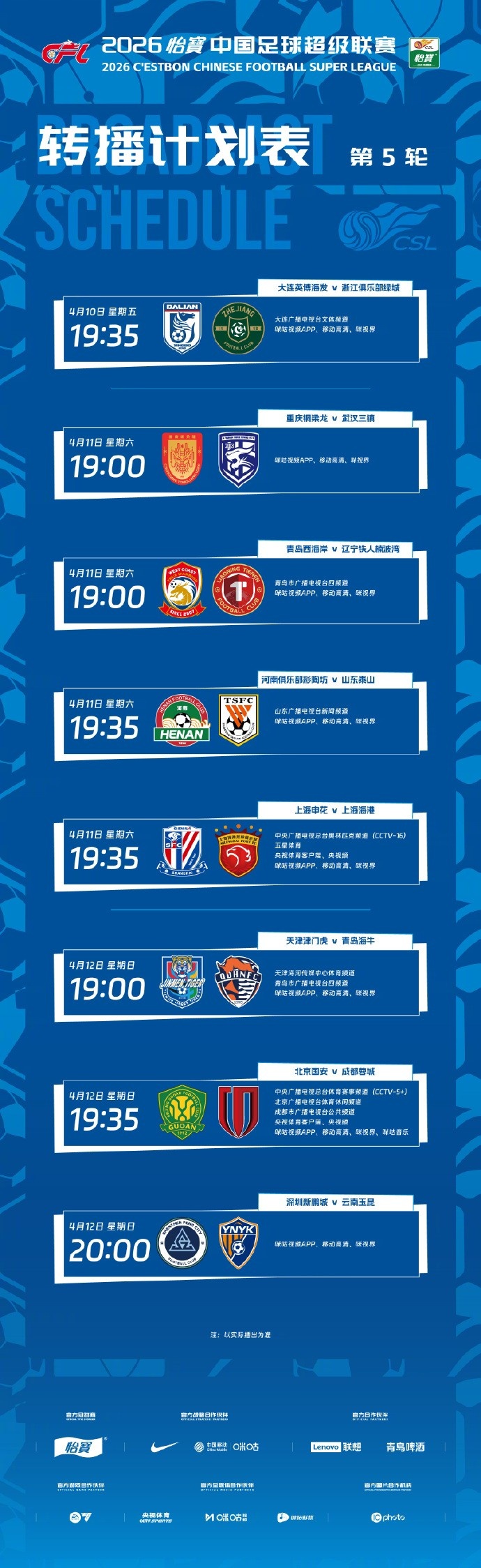 中超第5轮转播计划:CCTV16转播上海德比,CCTV5+转播国安vs蓉城